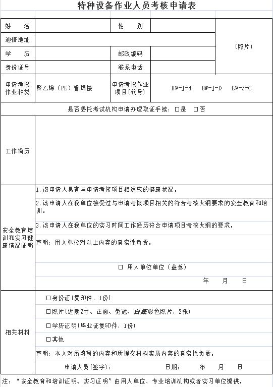 1、參加培訓考證人員,請如實填寫特種設備焊接操作人員考試申請表1份,加蓋單位公章;